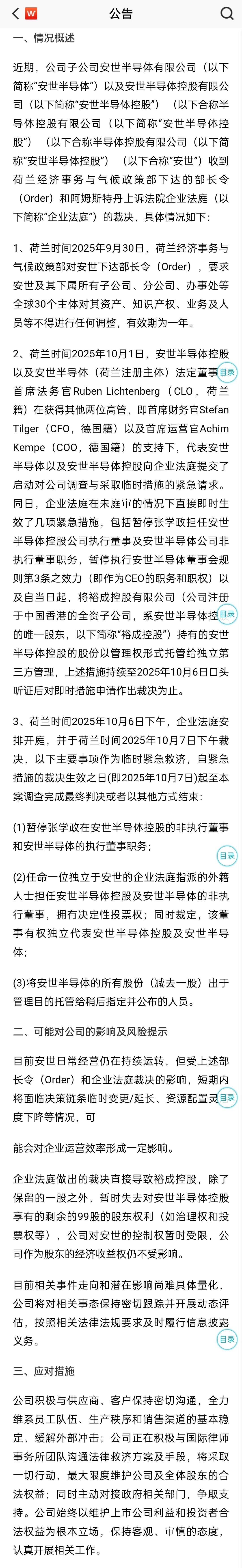 10月12日,闻泰科技(维权)公告,荷兰政府9月30日发出指令,要求冻结闻泰科技的控股子公司安世半导体对资产、知识产权等进行调整,为期一年。与此同时,安世半导体部分外籍高管要求闻泰科技转让安世半导体股权,要求暂停闻泰科技委派的CEO职务。